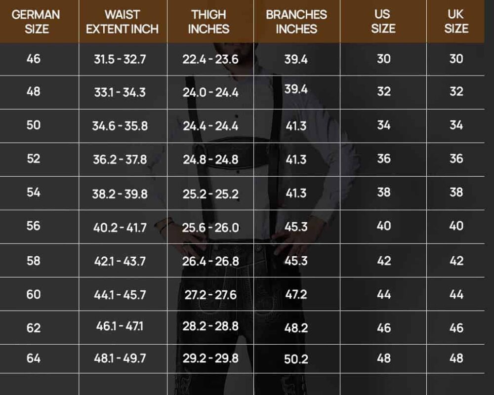 At LederhosenForSale, we offer a curated selection of high-quality Bundhosen, crafted from the finest materials and designed to elevate your Oktoberfest outfit or everyday style. We understand the importance of a perfect fit, so browse our collection and find the Bundhosen that will make you feel confident and ready to embrace the spirit of Bavaria. Check out the size guide below: