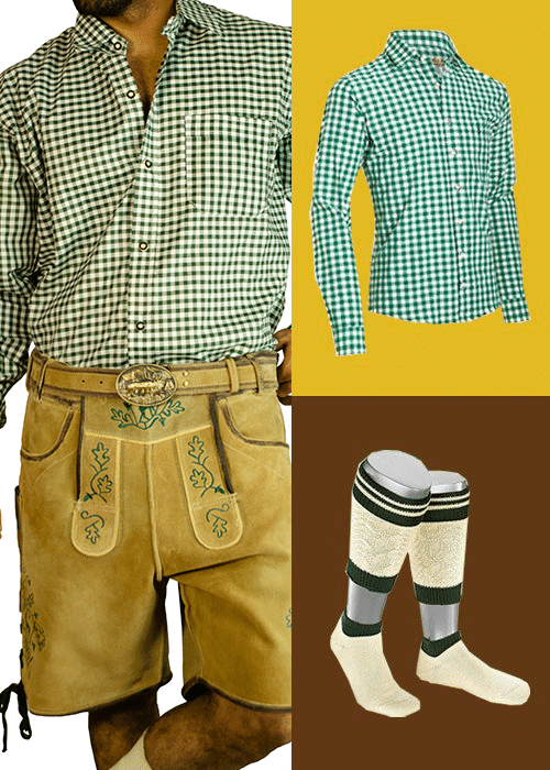 Most Common shirts that are used with lederhosen for men are checkered shirts in Blue, Red, and Green colors. White embroidered shirts are also very common to use with lederhosen