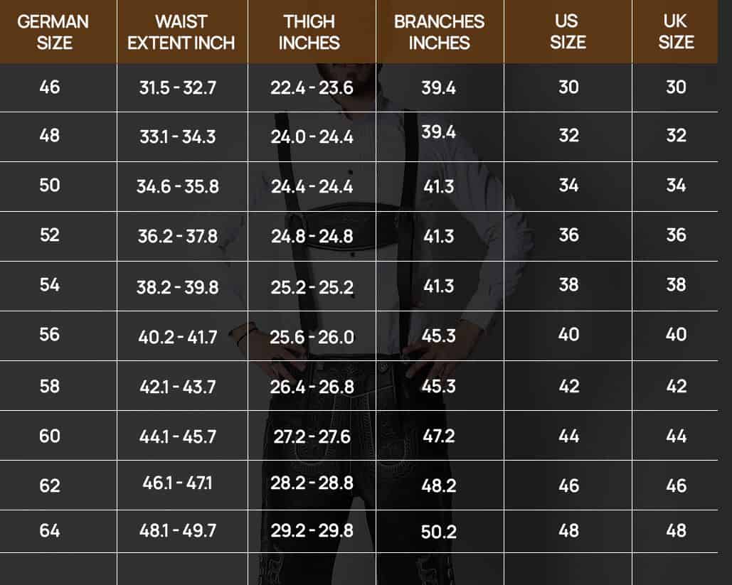 At LederhosenForSale, our aim is to assist you in finding the perfect fit with precise measurements, accurate to the nearest inches or centimeters using our lederhosen size guide. You can refer to the provided Size Charts below for guidance. Should you have any questions or need additional information, feel free to reach out to us using the Contact Us Form.